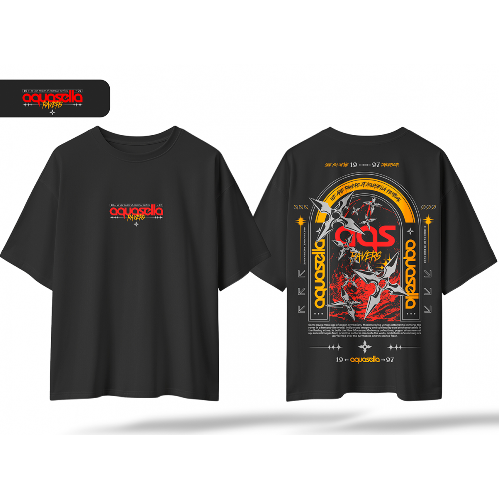 Camiseta oversize negra de algodón con diseño exclusivo de Aquasella. Estampación delantera y trasera. Disponible en tallas S, M, L, XL y XXL.